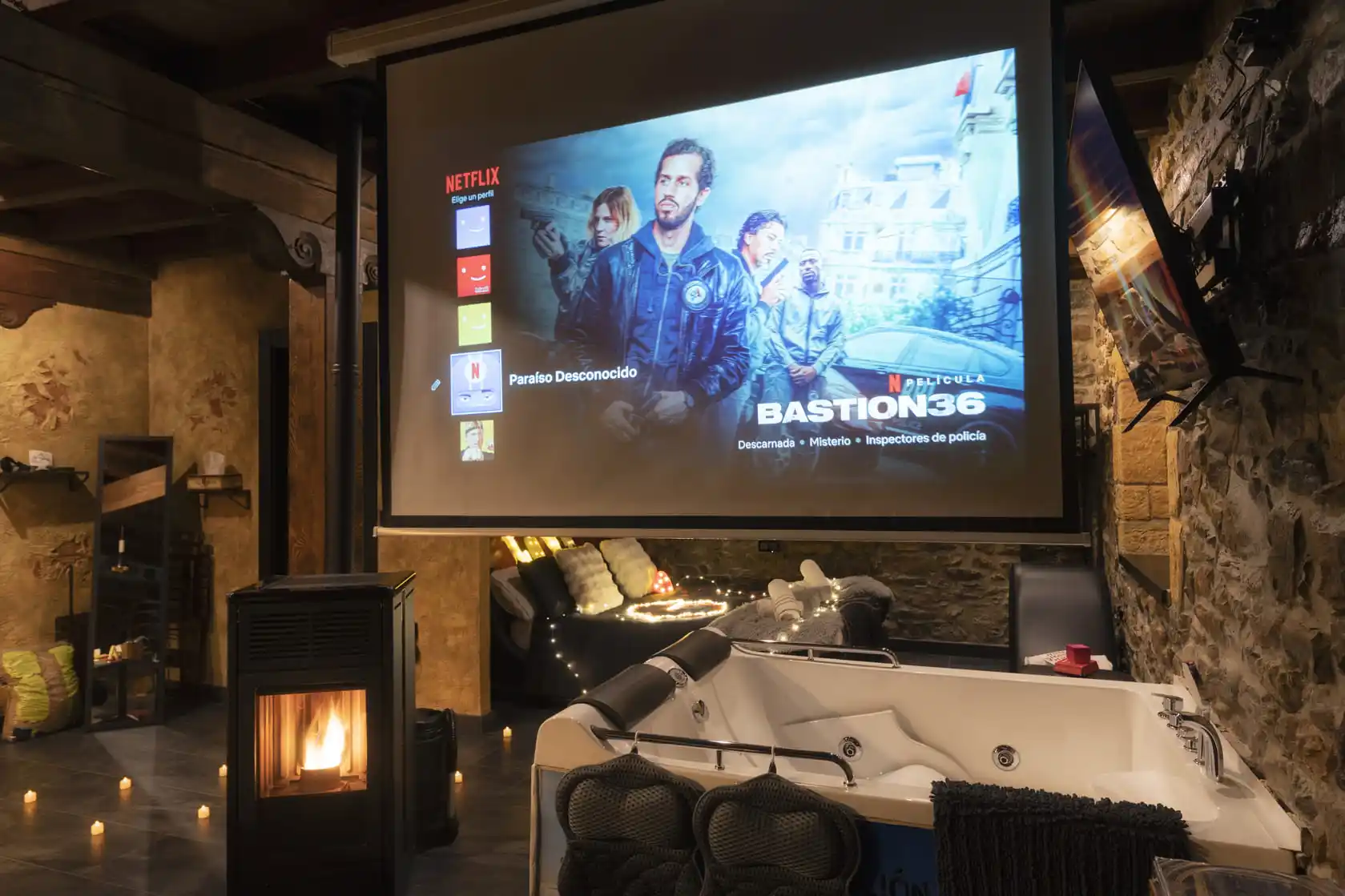 Cama doble, sillón tántrico, jacuzzi, cine...